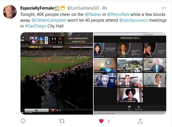 On Twitter, Lori Saldana makes a good point. Perhaps the slow pace of governments re-opening to in-person interaction is just a function of the fact that they are not driven by the financial need to get people into the seats, as many businesses are. Whatever the case, these types of situations make clear what value some agencies place on public participation. The Orange County Register today has coverage of debates in OC about these issues, noting that Costa Mesa and Anaheim city councils have reopened to in-person attendance but that the Orange County Board of Supervisors is still trying to sort out its policy.